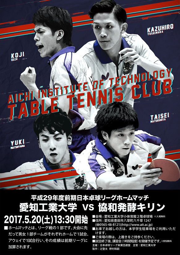2017年5月20日(土)13:30~愛知工業大学小体育館2階卓球場にて愛知工業大学vs協和発酵キリンの試合が行われます。入場無料となっておりますので、ぜひお越しください。